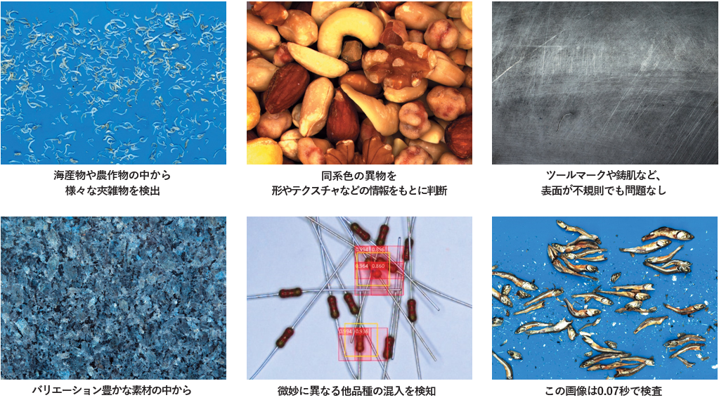 海産物や農作物、工業製品など、形状やテクスチャが不規則でルール化が難しい対象でも、不良や異物を高精度に検出できます。金属片や髪の毛などの異物混入、残留物検出など、幅広い業種で利用可能です。